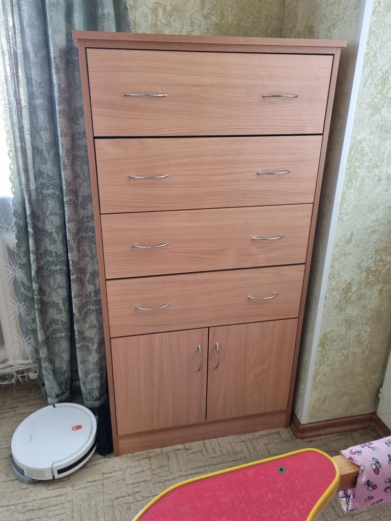 Всем доброго времени суток! Случайно наткнулся на этот комод и эту компанию во время поиска мебели в интернете, искал себе что-то похожее на "шкаф-комод". Очень зацепило, то что прямо на сайте можно выбирать многие размеры и параметры мебели. А в 3D режиме смотришь как будет выглядит мебель в разных расцветках. Определился с размерами и параметрами, разместил Заказ 00000353924. Через 10 минут со мной уже связался менеджер, уточнил параметры которые я немного изменил, уточнил адрес и уже назначил доставку на 4 день, что меня очень удивило, так как мебель под индивидуальные параметры обычно изготавливается гораздо дольше. Доставка до подъезда бесплатная, что очень тоже порадовало.Теперь о негативном.1. Негатив начинается уже со сборки. Отсутствует схема сборки, в моем случае был только чертеж, без каких либо параметров(просто картинка мебели). Но наклейки на каждой детали мебели, компенсируют отсутствие схемы.2. "Пакет с фурнитурой" - это конечно прикол... все саморезы(разных размеров), винты, гвозди и тд, всё это в одной куче, я уже не говорю о том что нигде не указано, какой и куда предназначается, но то что при сборке теряешь до 30 минут времени что бы перебрать всю фурнитуру по кучкам и по пакетикам, что бы облегчить потом поиски при сборке... Ну неужели пакетики такие дорогие, что бы разделить это всё?После завершения сборки мебели, в моём варианте исполнения, обнаружилось несколько проблем.1. Так, как я заказал с изменением конструкции, со шкафом в верхней части комода и общая высота 1650, от веса начали разъезжаться стойки на 1-2мм в сторону, из-за чего начали выпадать из рельс центральные выдвижные ящики. Спустя 1.5-2 недели, мне бесплатно довезли две царги для стяжки, которые я установил в центральную часть комода и проблема ушла.2. Заказал два выдвижных ящика с дополнительными разделёнными ячейками(6 ячеек). Их можно выбрать прямо с сайта, во время конфигурации мебели. Две дальние ячейки практически не доступны, так как ящик выдвигается не до конца, остается доступ к ячейкам в 3-4 сантиметра. Считаю это технический недочет проектировщиков. Что бы это исправить мне предложили либо переделать полностью ящики за мой счёт с немного другим расположением ячеек, либо докупить специальные направляющие с полным выдвижением. Тут я конечно удивился, что этот косяк повесили на меня. Потому что на сайте нет ни какой информации, схем и чертежей на этот счет, как это будет выглядеть изначально не мог знать и даже не предполагал что такое может быть. Ящики так и остались неисправленными, пользуюсь пока так.3. Дверцы шкафчика. После регулировки, с каждой стороны имелся зазор почти в 5мм, что очень выглядело нелепо. Щели такие что можно было разглядеть содержимое шкафа. Долго спорил с гарантийным отделов, в итоге признали гарантийным случаем и поменяли дверцы бесплатно. Новые дверцы, каждая шире на 2-2.5мм, в итоге отрегулировал на стандартный зазор в 3мм.4. Пол шкафчика. На чертеже не разглядел, что он утопленный, по отношению фасада выдвижных ящиков и шкафчика дверей, а фасад не укрывает эту щель. Это смотрелось очень не красиво, в связи с этим мне пришлось докупать отдельно эту деталь, которая стоила дополнительно 850р. Косяк признали за мной, так как я не разглядел чертеж, несмотря на то, что на сайте выглядит это по другому.Так же забыли положить подпятники, но их довезли вмес