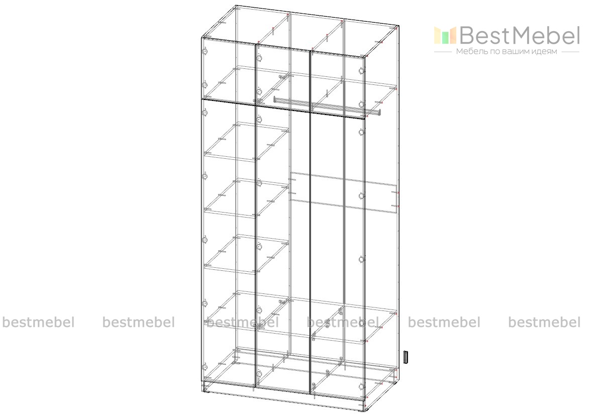 Современный дизайн и стильная фурнитура придают шкафу изысканный вид, делая его не только функциональной, но и декоративной частью интерьера.Шкаф оснащен просторными полками, штангой для вешалок, что обеспечивает удобную организацию пространства и позволяет легко поддерживать порядок. Без ручек, их можно добавить и приобрести отдельно на сайте.