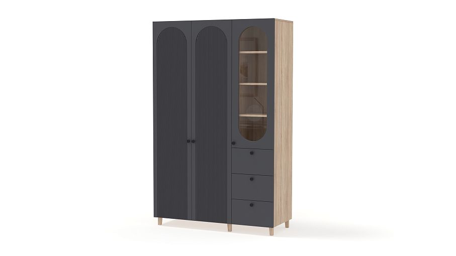 Шкаф распашной Рене 13 BMS объединил для хранения платяное отделение с двумя дверцами и витрину, комбинированную с тремя выдвижными ящиками. Одежда на вешалках, трикотаж, органайзеры с мелочами, книги и декор размещаются компактно и эстетично. Сочетание темных и природных древесных оттенков с декоративными вырезами и фрезеровкой — стильное современное решение. Купить шкаф распашной Рене 13 BMS вы всегда сможете в нашем интернет-магазине с изготовлением по индивидуальным размерам.