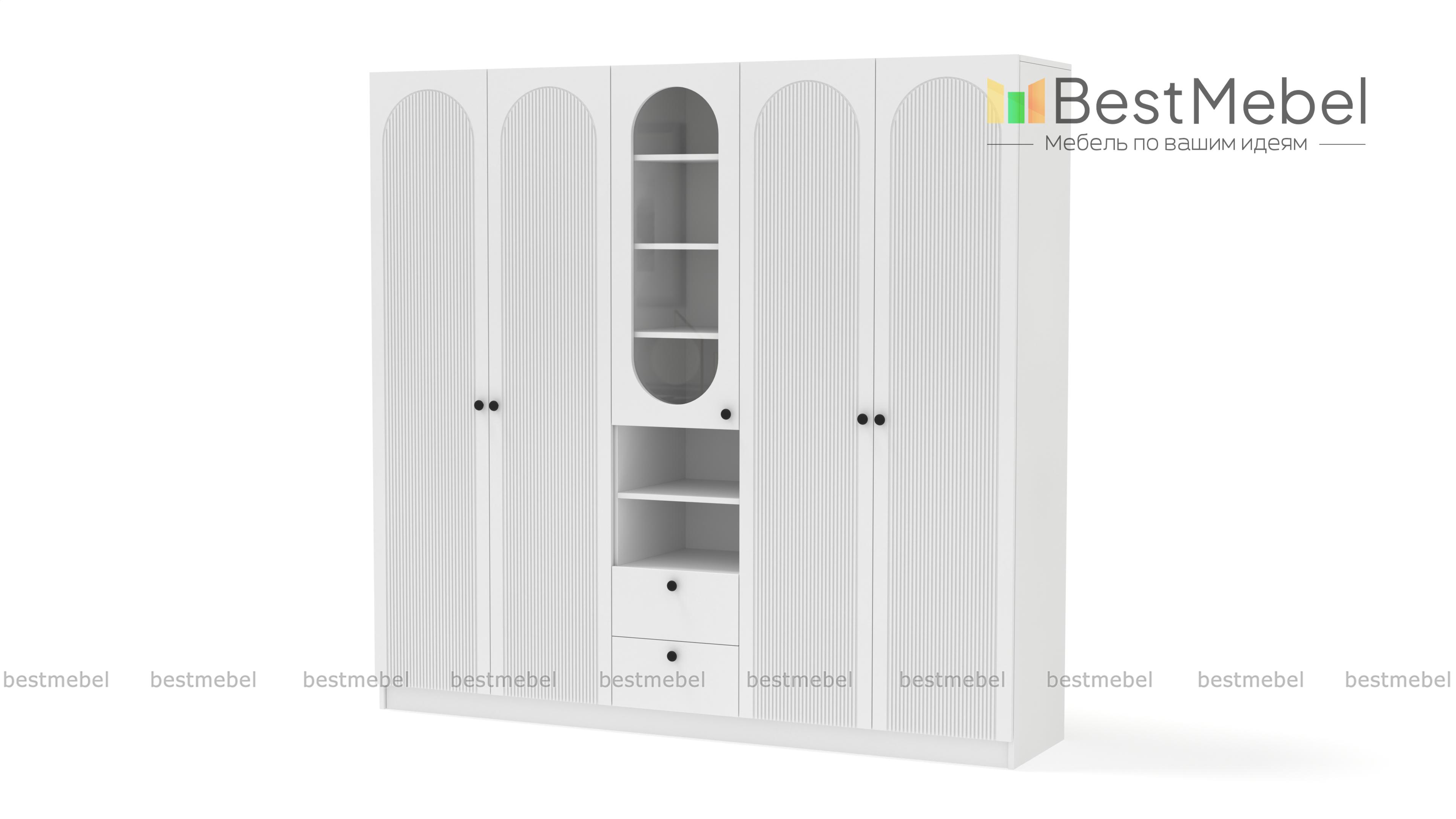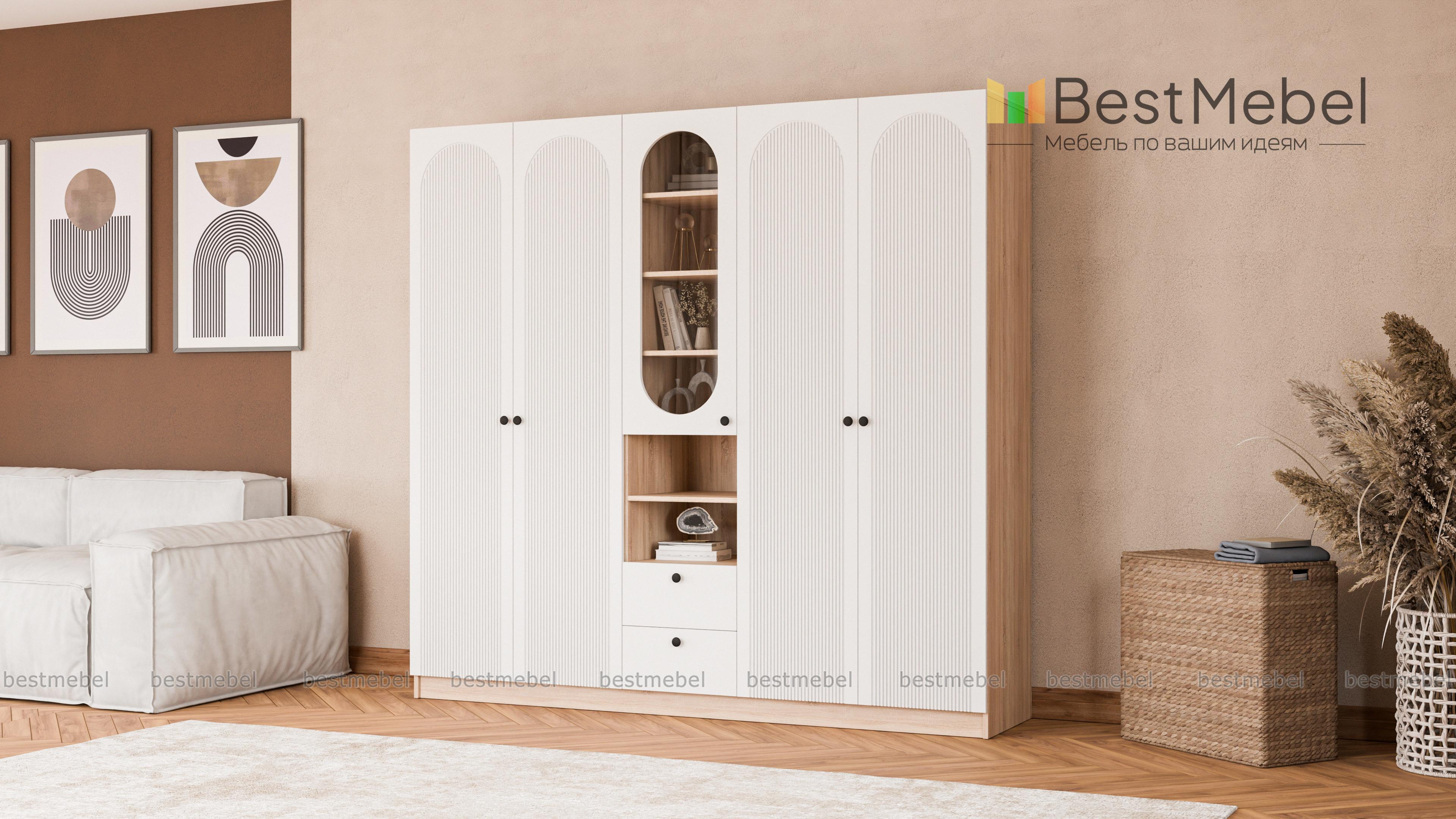 Шкаф распашной Рене 15 BMS — это композиция для гостиной или спальни, объединившая двухдверные отделения для одежды и комбинированную с ящиками и полками витрину. В одном месте будут компактно храниться предметы гардероба, важные мелочи, книги и еще многое другое. Фрезеровка на дверцах шкафа, выполненных из МДФ, повторяет форму изящных вырезов витрин. Купить шкаф распашной Рене 15 BMS, изготовленный по вашим размерам из качественных материалов, приглашаем в наш интернет-магазин.