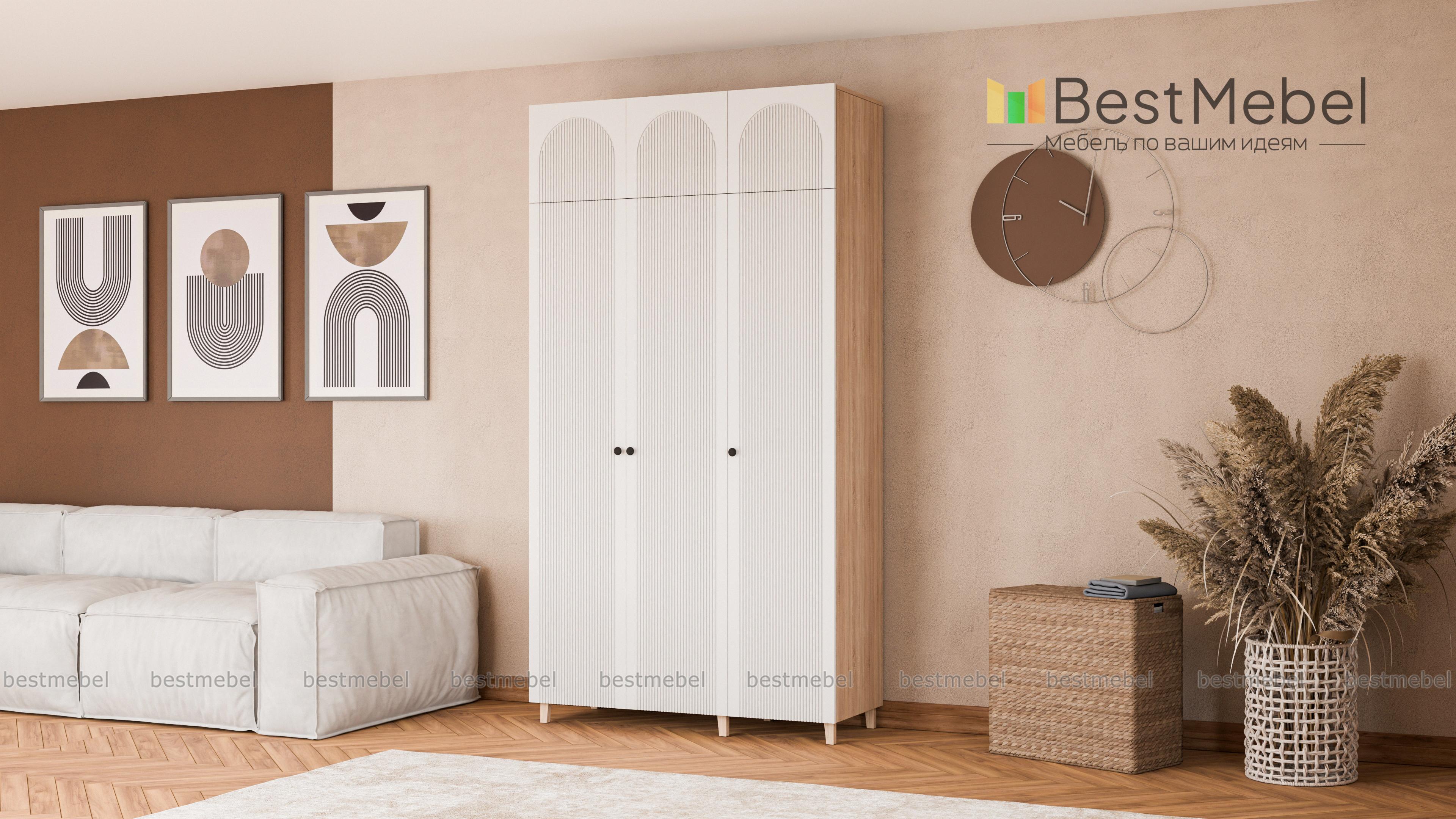 Шкаф распашной Рене 25 BMS сделает хранение в спальне, детской или прихожей удобным и эстетичным. Все предметы гардероба и постельные принадлежности будут скрыты за изящным фасадом с арочными вырезами и рельефом. Корпус и фасад выполнены из ламинированной ДСП и МДФ светлого оттенка, а дополнительную легкость высокому трехдверному шкафу с антресолью придают деревянные ножки. Купить шкаф распашной Рене 25 BMS вы всегда сможете в нашем интернет-магазине, по желанию изменив цвет и размеры.