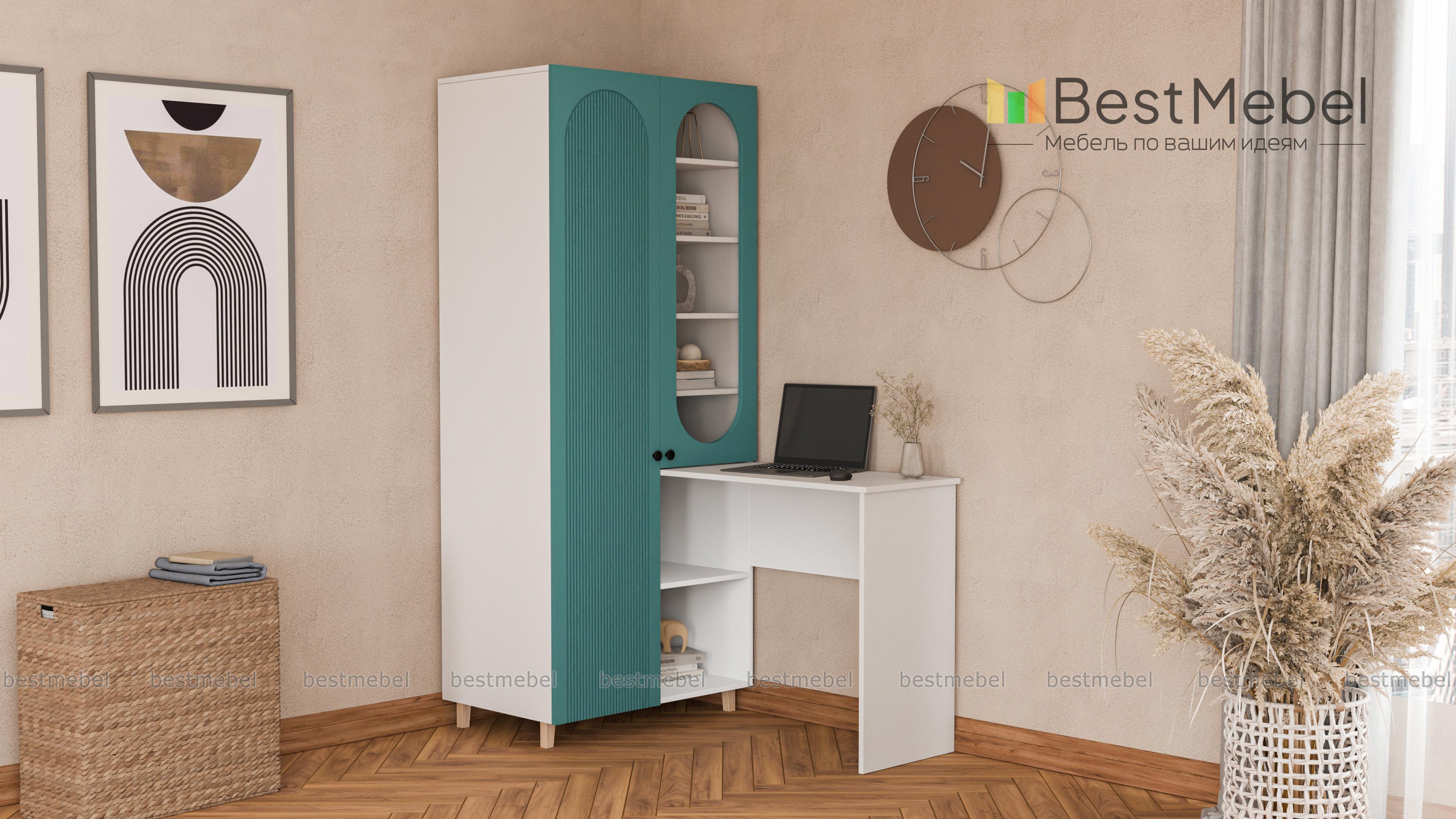 Шкаф со столом Рене 4 BMS — это многофункциональная современная мебель для детской комнаты или гостиной. Угловая композиция включает в себя распашной шкаф, оснащенный закрытым отделением для одежды, полками и витриной, и письменный стол. Стильные акценты в отделке — овальный вырез витрины и фрезеровка фасада, устойчивость и легкость дарят высокие ножки. Купить шкаф со столом Рене 4 BMS, изготовленный по вашим размерам, приглашаем на сайт нашего интернет-магазина.