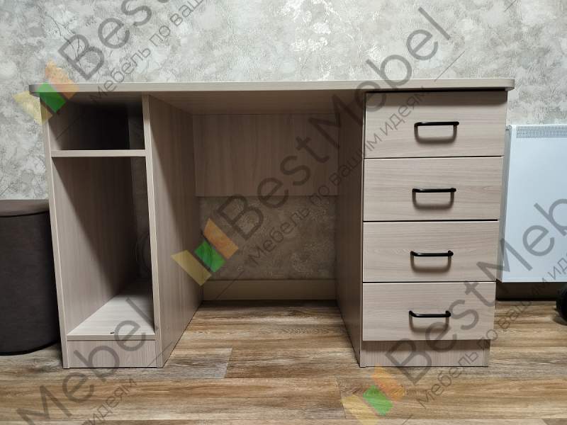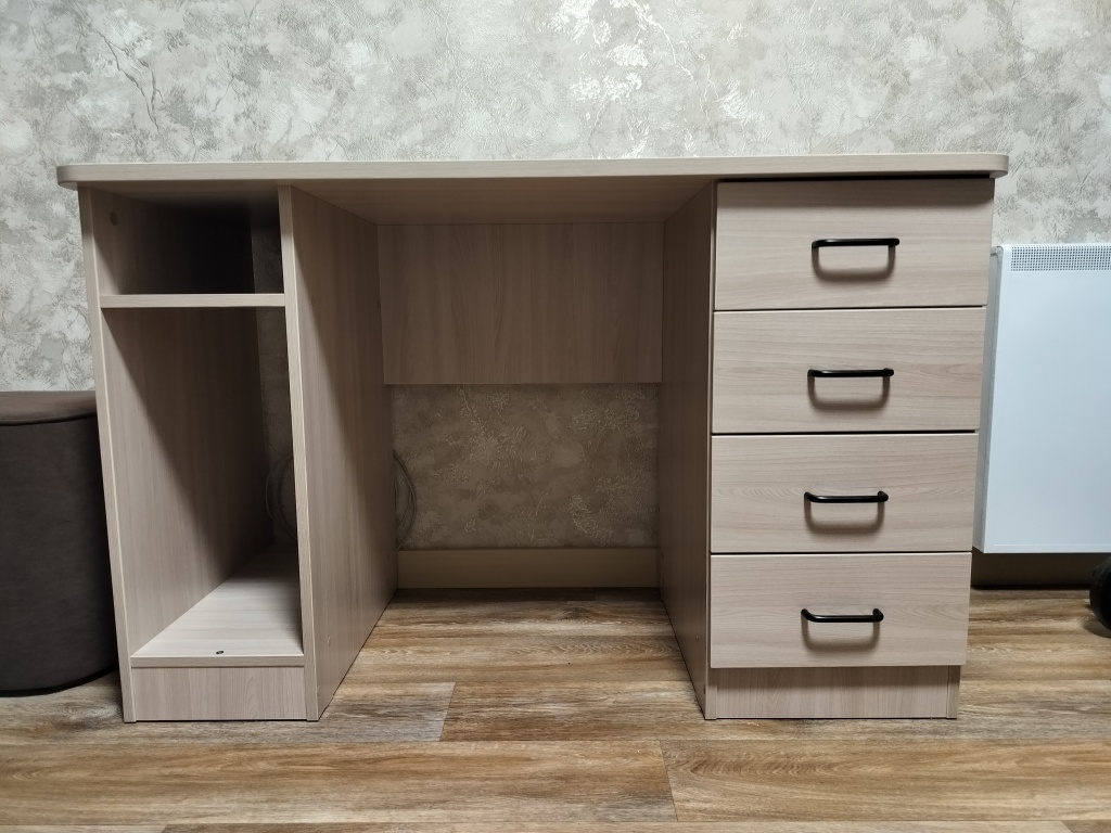 У стола не стандартные размеры, также были пожелания по отдельным элементам (один из которых вырез в задней части столешницы).Внешне очень понравился, хорошо вписался. Во качество на четверку, был небольшой скол в невидимой части стола и пара царапин с тыльной стороны - это не критично так как не видно. Так же в комплекте шли черные мебельные подпятники, хотя к такой расцветки - бежевые (может под цвет ручек ящика для контраста - не критично) Собирал сам, легко разобрался (есть электронный чертеж с описанием и номером детали) крепеж в полном комплекте.Хороший рабочий стол, по приемлемой цене. Спасибо!