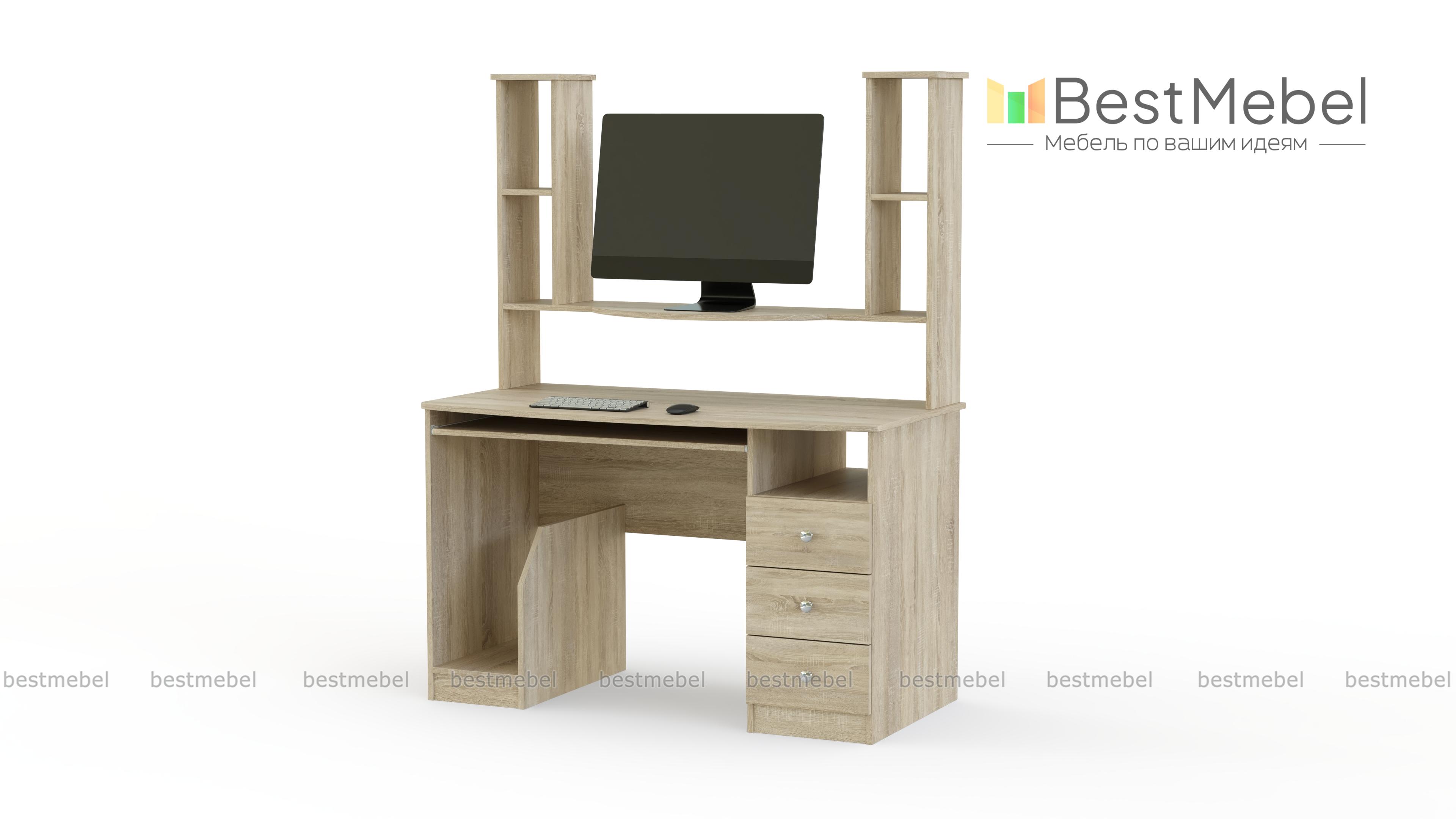 СК-001 – идеальный вариант для учащихся и работающих людей. Стол оснащен открытой нишей для системного блока, выдвигающейся панелью для клавиатуры, тремя ящиками для разнообразных документов. Также на столешнице прикреплен стеллаж с множеством полок, где можно разместить предметы декора, сувениры, документы или книги. На сайте Вы можете найти палитру цветов, а также можно подобрать параметры модели. Купить изделие можно в нашем интернет-магазине по доступной цене.