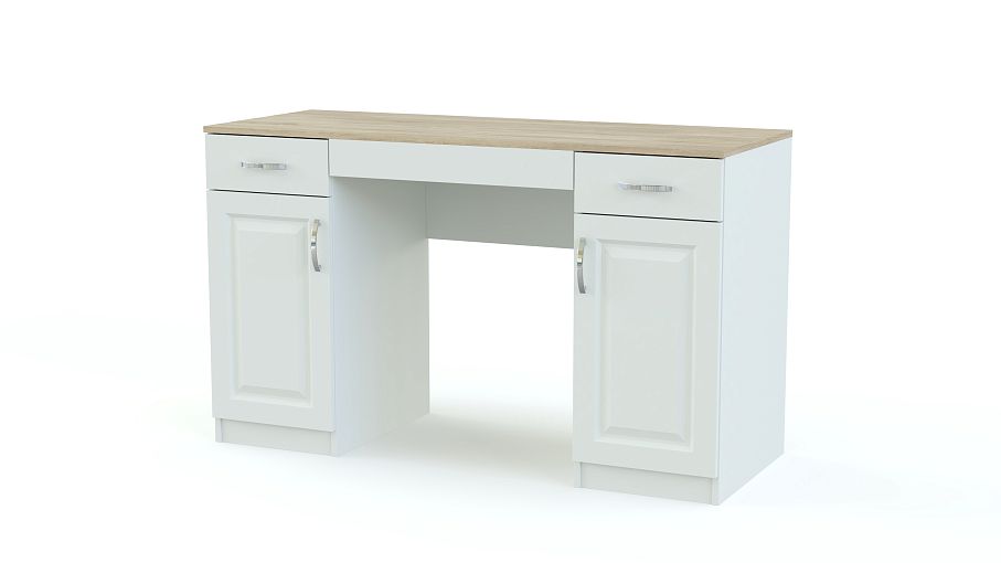 Стол туалетный Виктория BMS – простая и элегантная модель для роскошного классического интерьера. Столик в модной расцветке с имитацией массива дуба декорирован фигурно вырезанными фасадами с фрезеровкой и изящной фурнитурой под серебро в ретро-стиле. Под просторной столешницей располагаются две боковые тумбы с выдвижными ящичками для мелочей и распашными отделениями с полками. Купить стол туалетный Виктория BMS по приятной цене вы всегда сможете в нашем интернет-магазине.