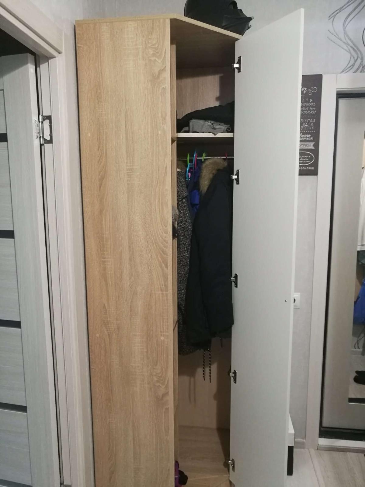 Шкаф получился очень хорошим. По размерам небольшой, то что нужно в узкую прихожую, при этом много полочек, в которые аккуратно можно сложить шарфы, шапки, перчатки и т.д. Из небольших минусов, приходится использовать детские вешалки, так как другие не помещаются на штангу.