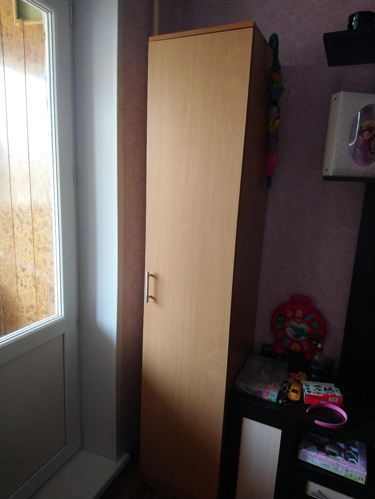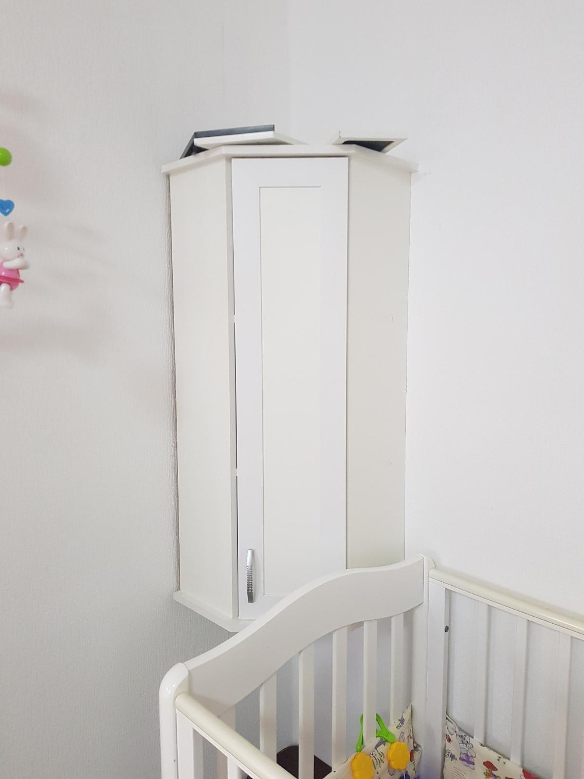 Шкаф нас удивил. Он оказался длинным и тонким (НЕ таким широким и коротким как на ваших картинках). Матового стекла в нем тоже нет. Он весь деревянный (или что там за материал). Мы думали хранить в нем папки, но они, конечно же, НЕ везли. В итоге мы приспособили его под детские вещи и, в целом, довольны. Смотрится стильно, как видите на фото (сверху лежит рамочка, не обращайте внимания). Убираться очень удобно, когда мебель висит. Благодаря вашей компании столы у нас тоже навесные и мы счастливы)