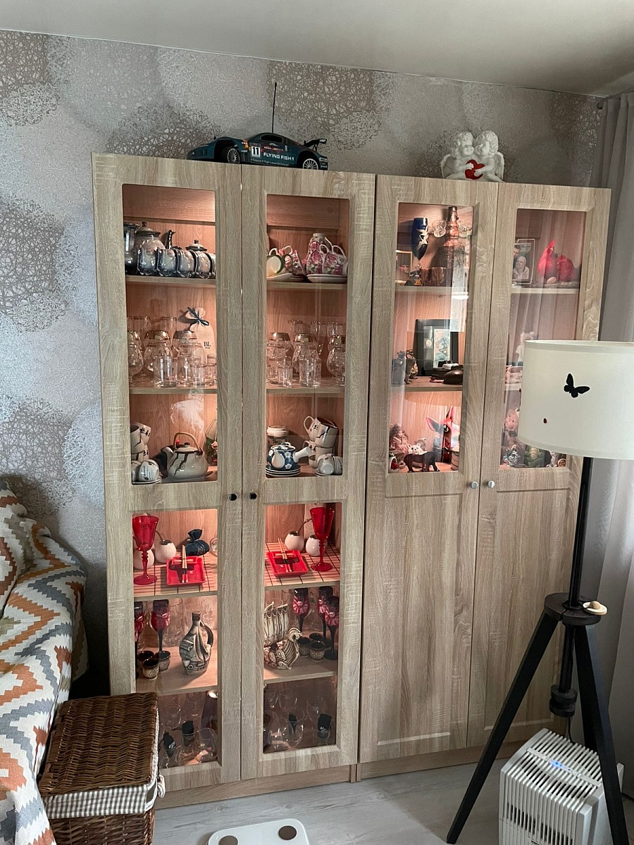 Идея с покупкой шкафа витала давно, долго выбирали модель чтобы соответствовала всем нашим "хотелкам". И наконец наткнулись на эту модель данной фабрики и как говориться запали. У жены очень много посуды , сервизов, просто всякие безделушки, накопленные за долгие годы, причем находилось все это  по всей квартире и занимало уйму места. Так вот этот шкаф вмемтил в себя все!!!!  Мы не поверили своим глазам но это так. Единственное, так это я провел в шкаф освещение, и уютными вечерами внутри загорается теплый свет....