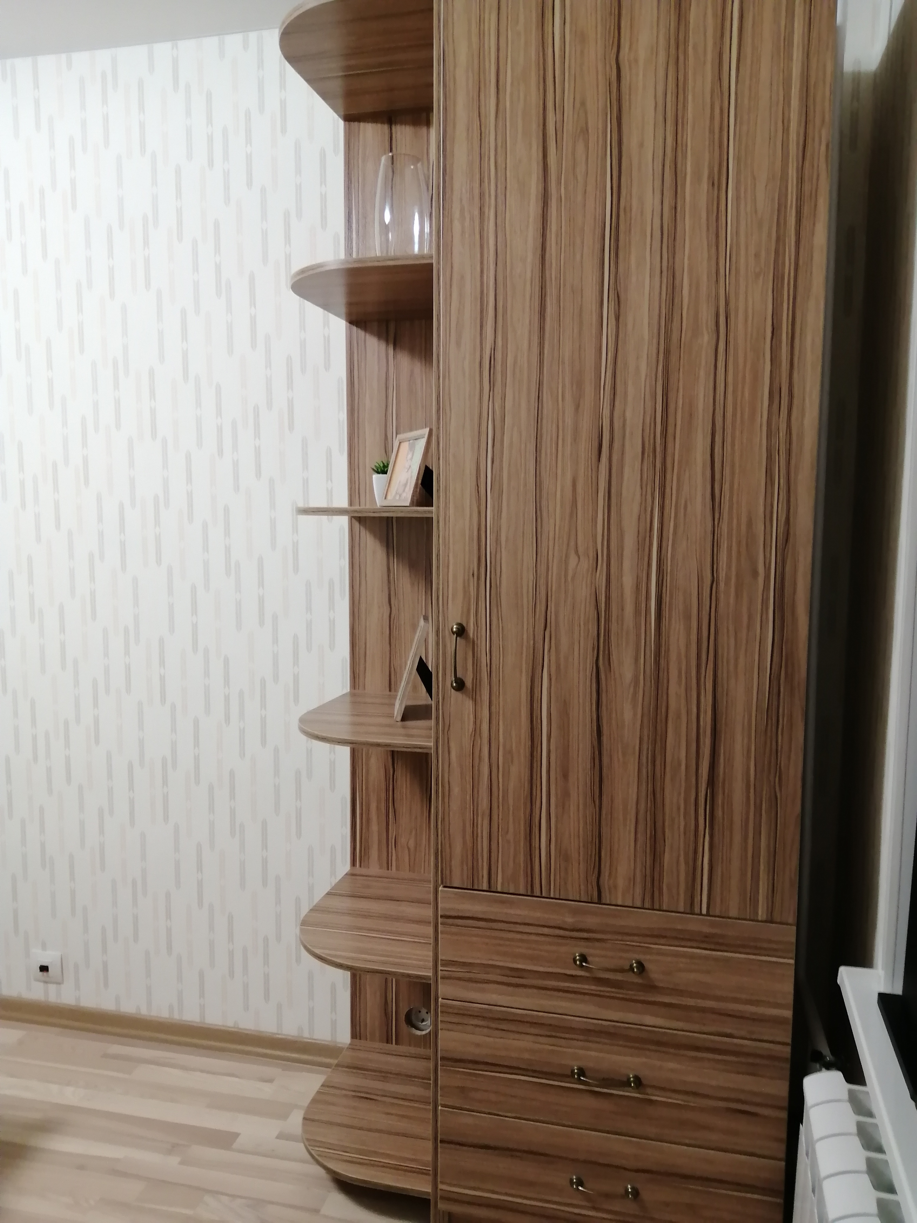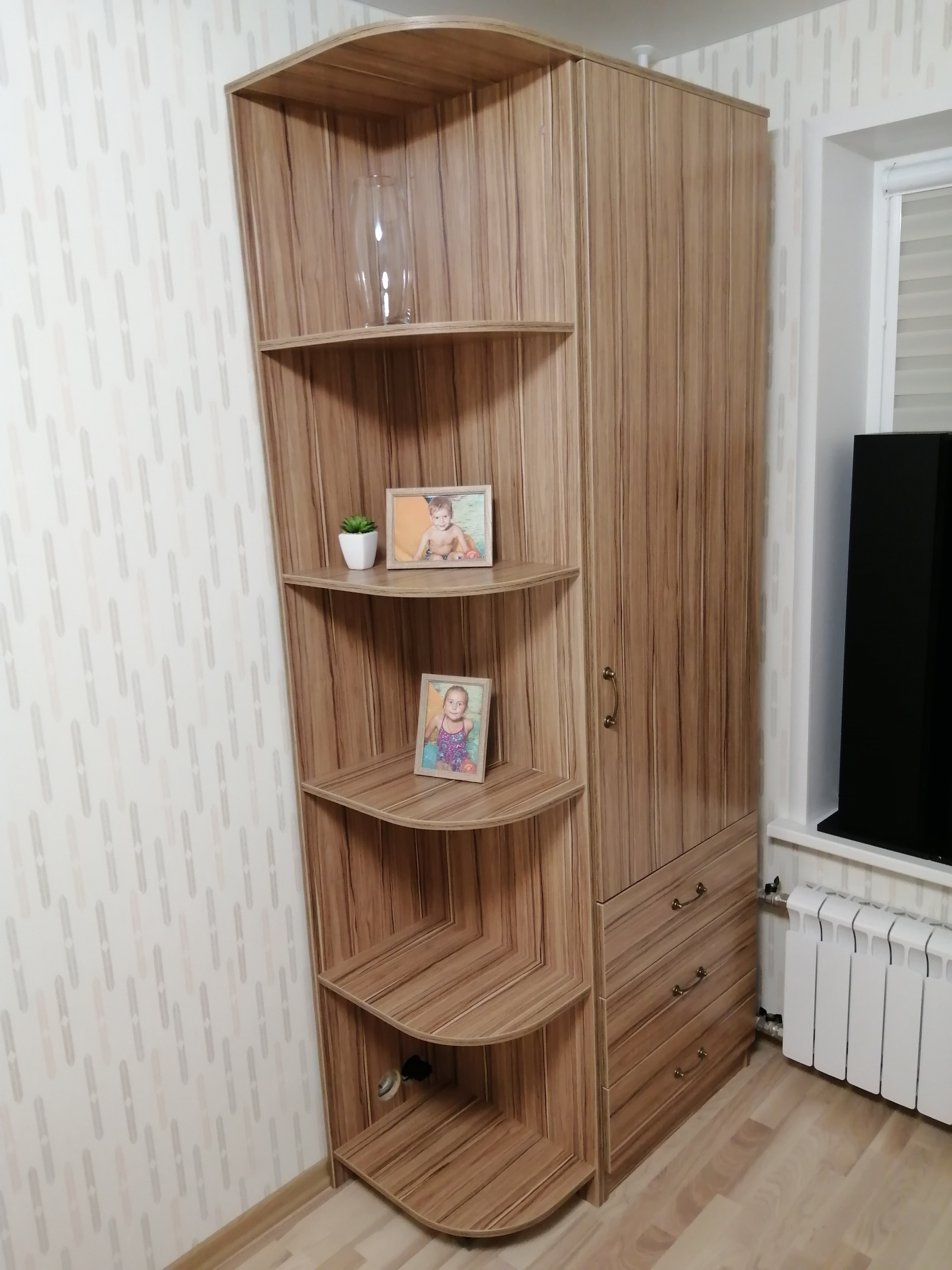 Выбирали экономичный и по цене, и месту в квартире. Нашли этот, но добавили к нему угловые полки. Получился удобный и функциональный шкаф небольших размеров. Так как полки внизу перекрыли розетки, то сборщик сделал вырещы под них, и теперь у нас и шкаф стоит, и розетки остались действующими. Докупали к ящика шкафа доводчики, ручки брали тоже из каталога под бронзу. Получилось недорого, но вид достаточно благородный. Вместимость шкафа оказалась такой, как нужно. Спасибо магазину.
