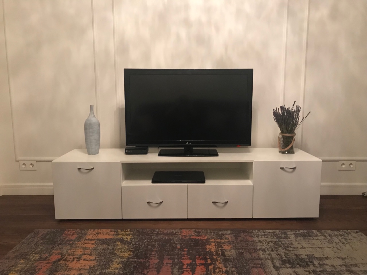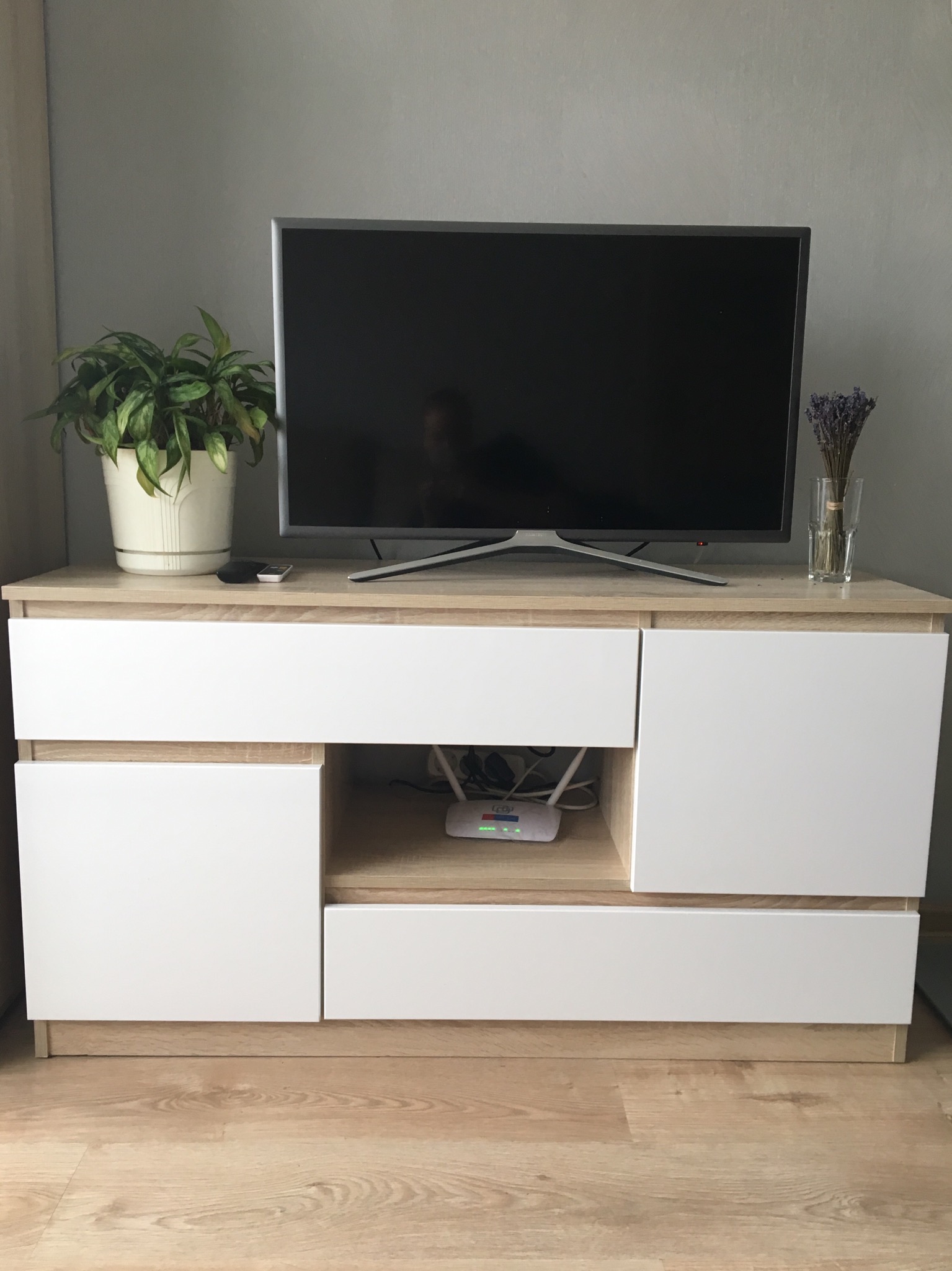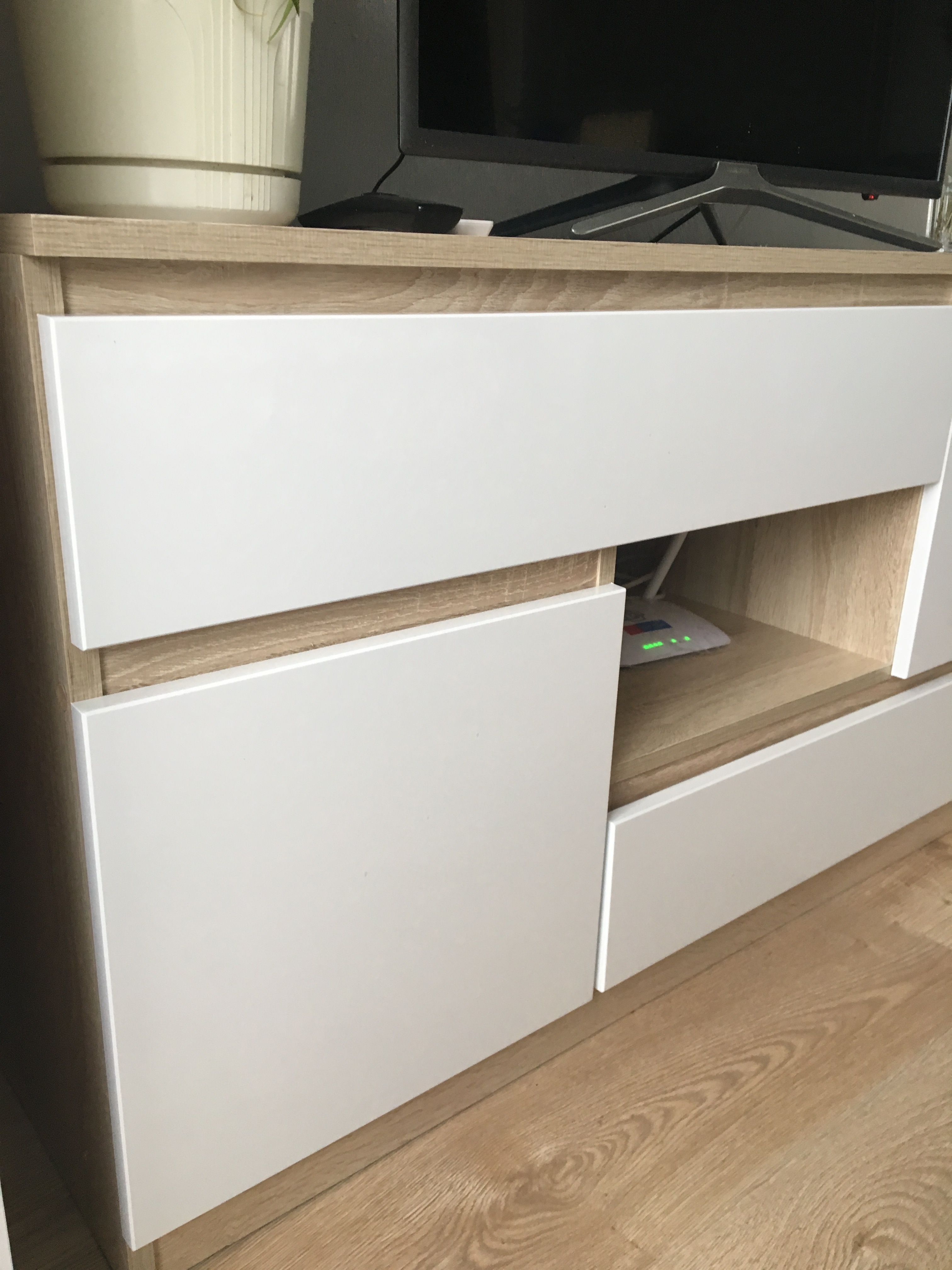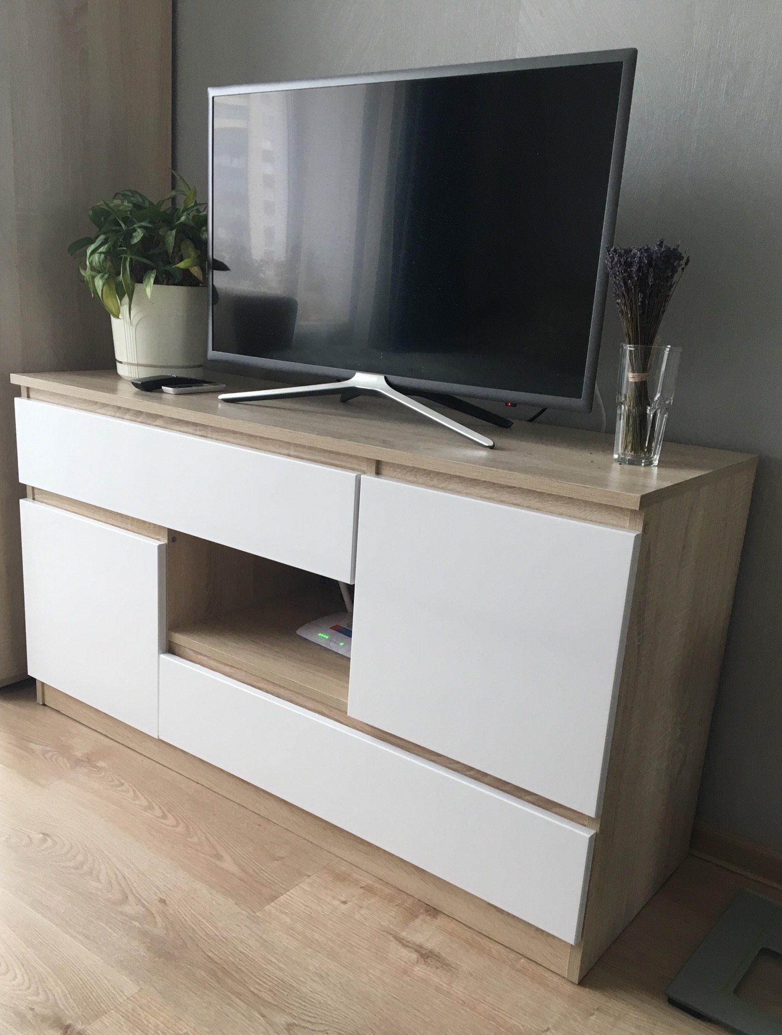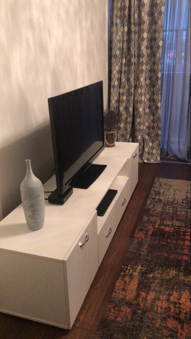 Стильный и оригинальный комод. Центральное отделение очень удобно для приставки и проводов. Внутреннее наполнение тоже устраивает, так как вместилось все, что нужно. Выглядит достойно. Единственный нюанс - неплотное прилегание выдвижного нижнего шкафчика: то ли дело в самой детали, то ли недоработка мастера-сборщика. Но в глаза не бросается, на отношении к комоду не сказывается