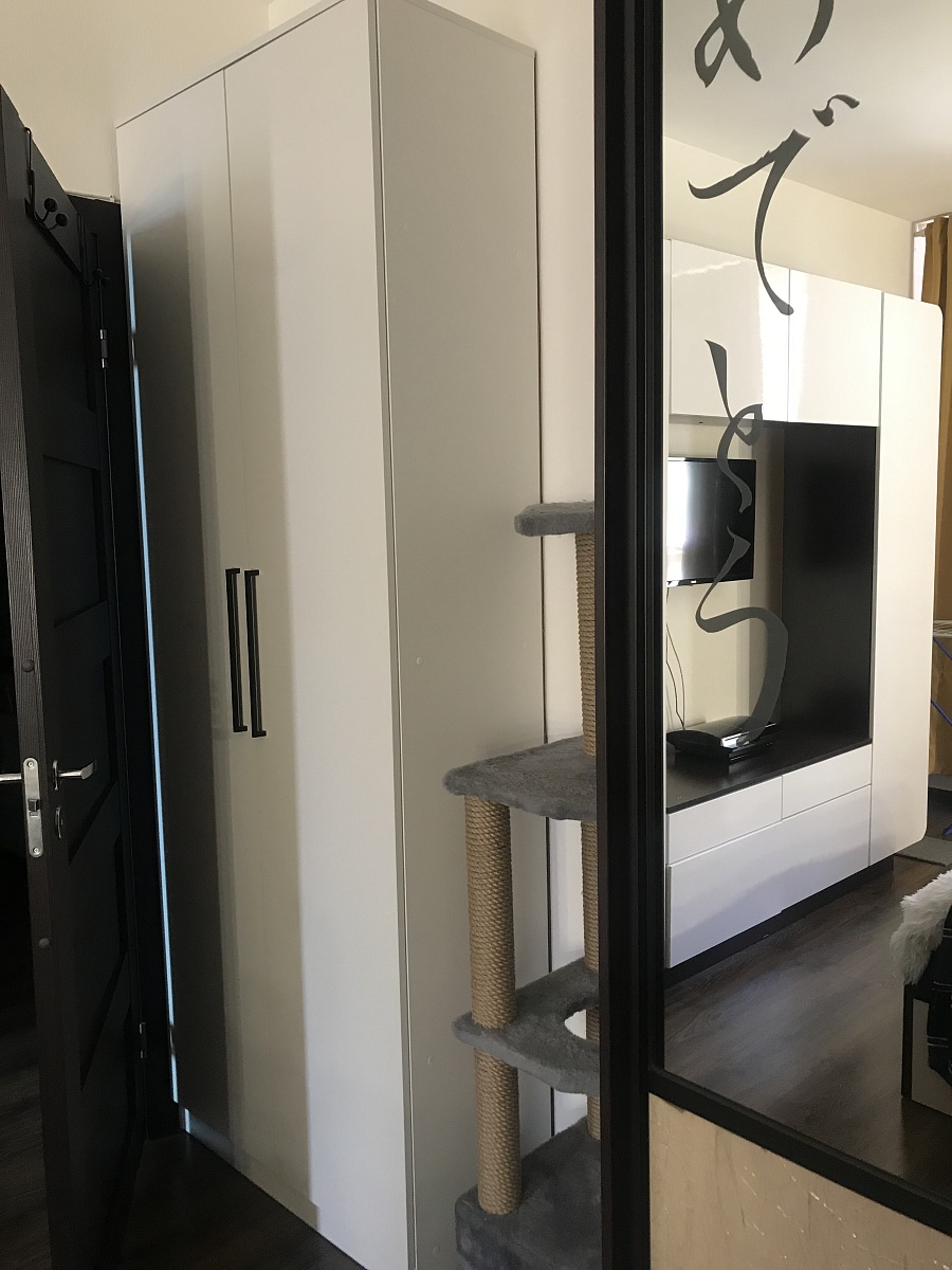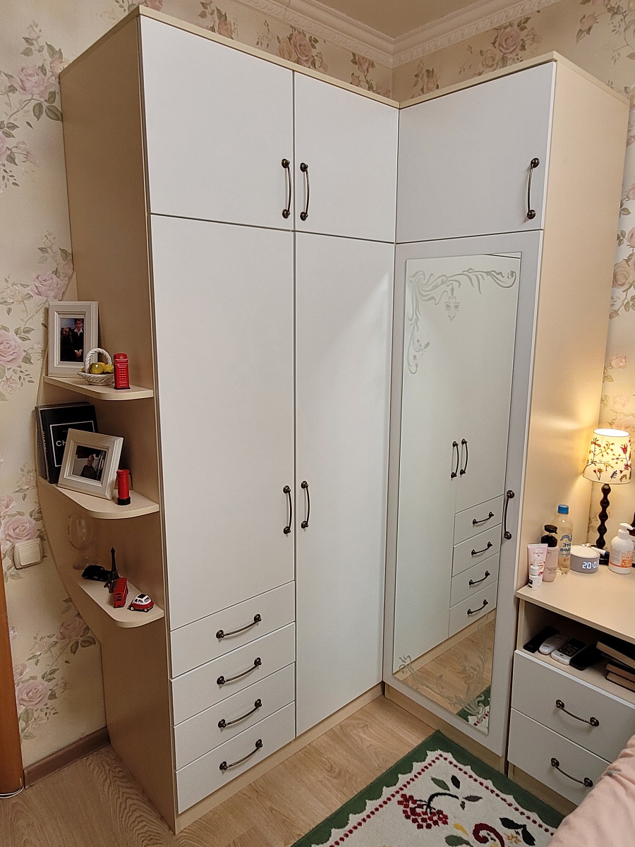 Шкаф заказывала по индивидуальным размерам. Очень удобно, что можно изменить практически все под свой вкус. В данном случае выбрала цвет фасадов и фрезеровку, которая мне была нужна, корпус заменила на эггеровский, петли выбрала с доводчиками хеттиш, на сайте нашла антресь которая открывается вверх, тоже доработала дизайн под шкаф и все дополнила  угловым элементом. Получилось, на мой взгляд отлично. Если ещё сравнивать с ценами на такой же шкаф в салонах мебели, то этот просто бомба по такой цене получился. Со сборкой тоже все без проблем, позвонили по телефону на сайте, договорились о времени. Сборщик профессионал своего дела, ему огромное спасибо. Единственный минус, почему то зеркала изготовили с отверстиями под держатели, а не наклеили их на фасад. Да ещё и держатели не положили. Пришлось срочно ехать покупать их, не хотели заморачиваться с рекламациями, ждать довоза или замены.